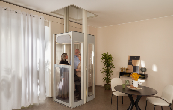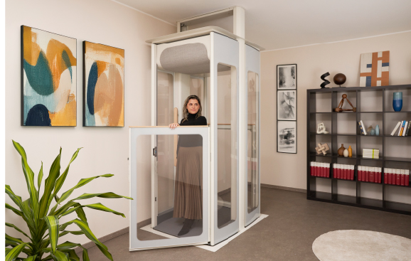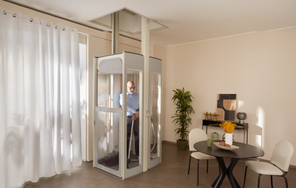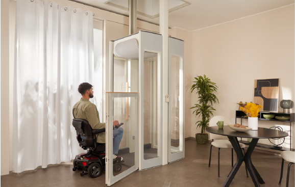 It is ideal for carrying up to 3 people or one person in a wheelchair while being surprisingly compact with a spacious feel, thanks to a unique and elegant design. The freestanding structure allows it to be installed anywhere in the home.